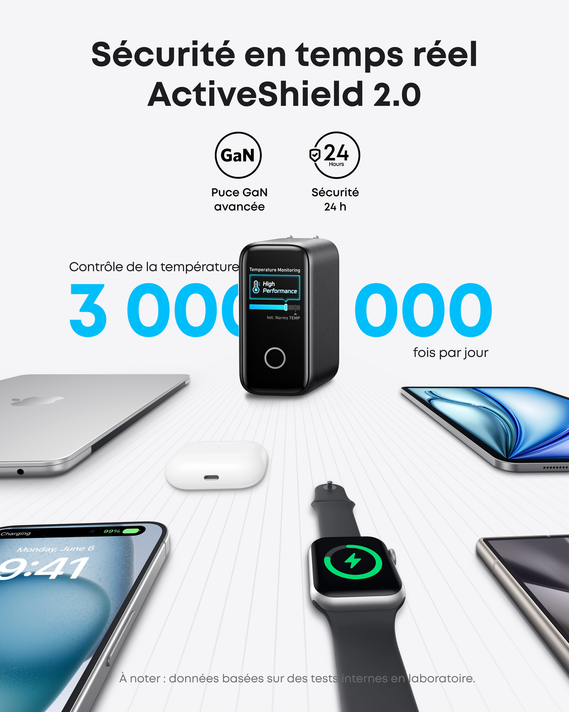 - Suivi facile et clair : l’affichage coloré haute définition fournit une vue détaillée des statuts de recharge de chaque port et de la température, pour que vous soyez toujours informé.