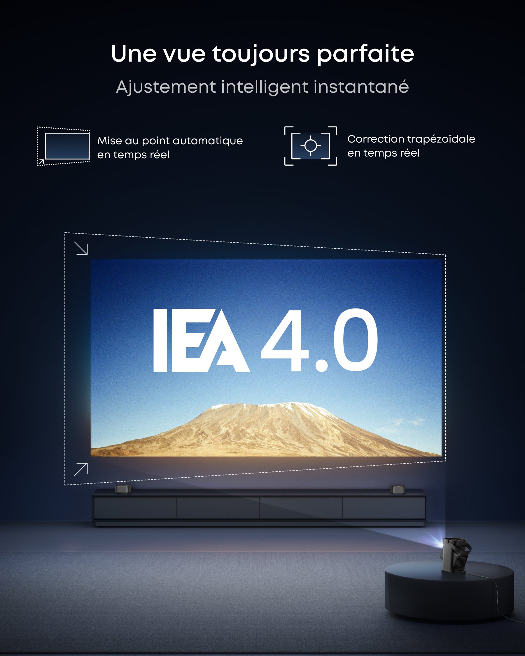 - Vue sans effort et ajustement instantané : Avec la mise au point en temps réel et la correction trapézoïdale, les images sont toujours parfaitement alignées. Le stabilisateur à deux bras (130°) permet de régler l'angle et d'obtenir des images stables.