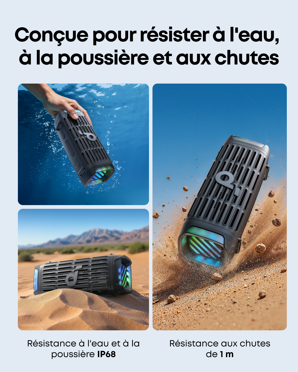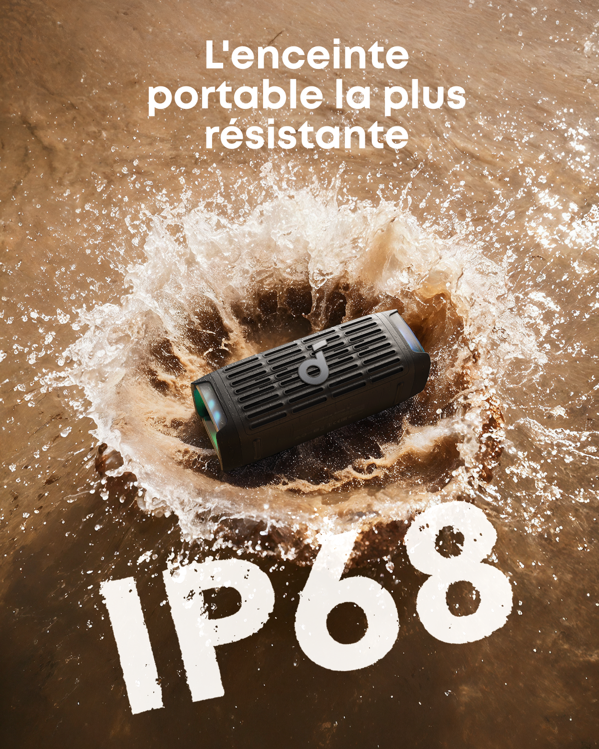 Résistance à l'eau et à la poussière IP68 Conçue pour résister aux intempéries, cette enceinte Bluetooth est totalement étanche à l'eau et à la poussière. C'est l'enceinte extérieure parfaite !
