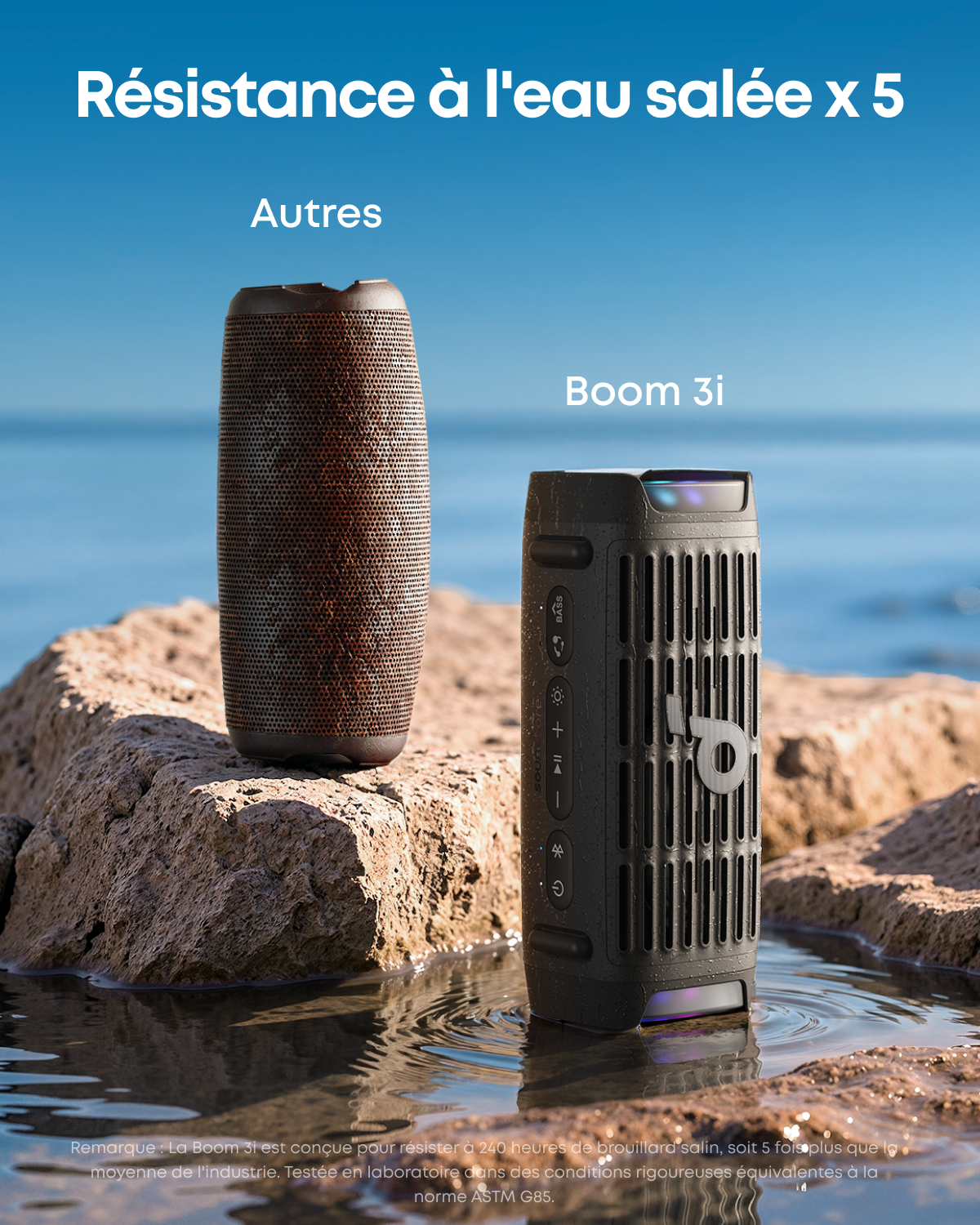 Conçue pour les conditions extrêmes, cette enceinte est cinq fois plus résistante à l'eau salée, à la sueur et au brouillard salin, et supporte sans difficulté une chute d'un mètre. Elle est donc parfaite pour les journées à la plage ou les sorties en bateau, sans risque de rouille ni de corrosion, tout en étant plus robuste que la plupart des enceintes d'extérieur.