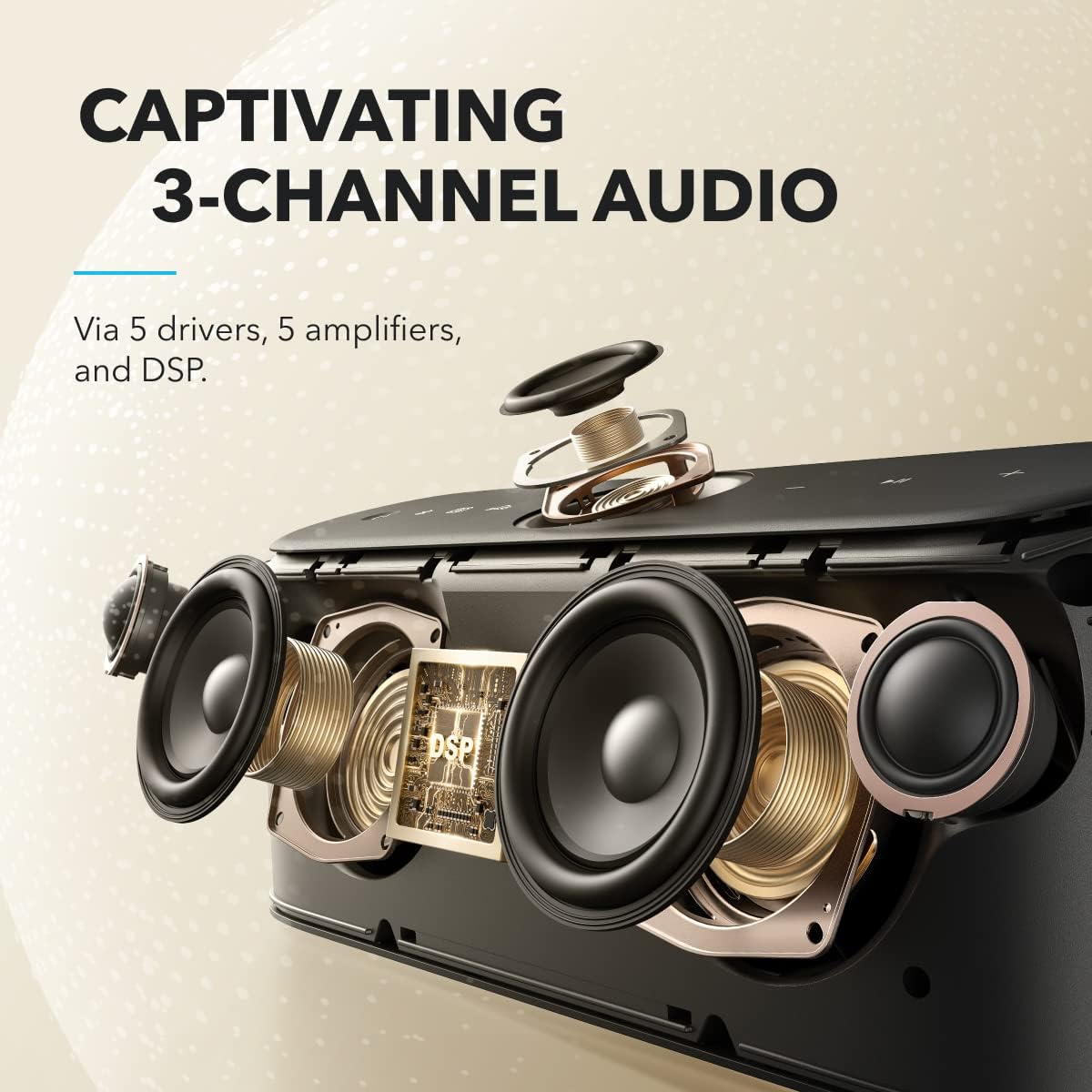 - Audio spatial immersif : inspiré de l'acoustique des théâtres, le Motion X600 dispose de 5 haut-parleurs et de 5 amplificateurs qui sont disposés de manière à diffuser le son tout autour de vous. Chaque fois que vous appuyez sur le bouton de lecture, vous avez l'impression d'être dans la même pièce que votre artiste préféré.